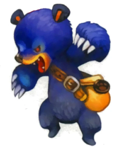 They resemble exactly an actual real life bear, only their color is fictional in comparison to the real life bears, their skin color is blue colored, these animals don't have any wearing cloths and it only has a bag with belt strap hanging on their body where their food is stored which is honey, these creatures have four sharp claws on each of it's arms.