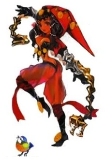 The wraps on his wrists, waist, and knees are violet in color and he wears baggy white pants that reach his knees with black tights/socks and yellow shoes that resemble ballet flats. His mantle appears to be pinned by a chain with diamond-shaped ornaments on it and he has a jeweled dagger in gold and blue sheathe. (His character artwork suggests it's supposed to be on his right hip, although it constantly shifts during cutscenes due to Vanillaware's habit of flipping sprites when characters face different directions to save time.)
